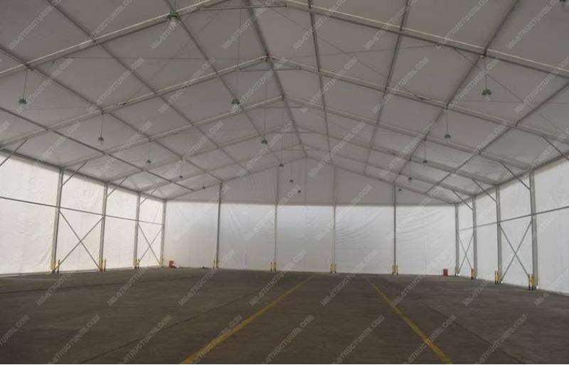 Aluminum frame tent is widely used as a warehouse tent. It’s with heavy duty aluminum frame, fireproof waterproof pvc cover. It’s easily installed and dismantled, and convenient to transport and store. This aluminum warehouse tent can reaches a wind loading capacity of 110km/h. There’s no any poles inside of this warehouse tent, so the inner space can be fully used. Forklift can move freely from one side to another. Steel color walls, rolling doors, ABS walls, sandwich walls are also optional for warehouse storage or industrial function use.